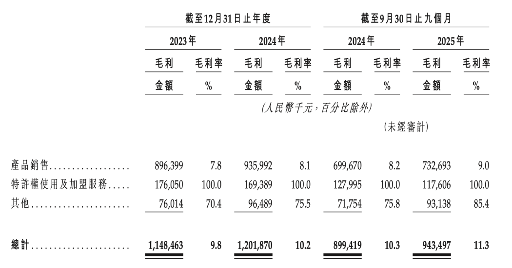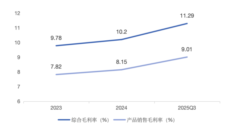 毛利率也反映出了這種趨勢,如錢大媽的營業(yè)收入、門店數(shù)量雖沒有增長,但綜合毛利率從2023年的9.78%提升至2025年三季度的11.29%,產(chǎn)品銷售毛利率從7.82%提升至9.01%。