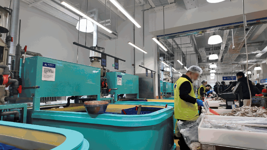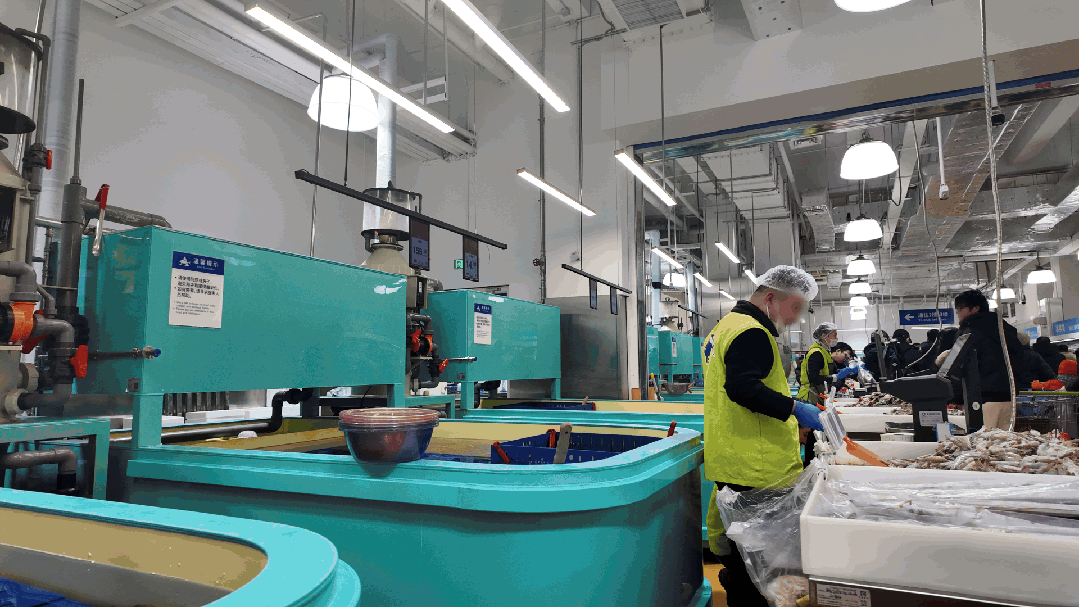 水產(chǎn)核心單品采用農(nóng)貿(mào)市場式的一對一服務(wù)的方式,后缸儲存,前向服務(wù),主力單品凸顯。