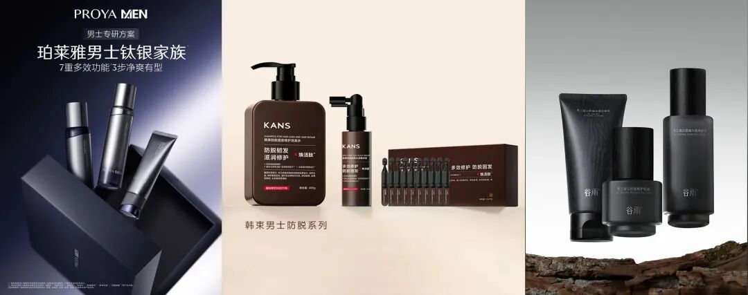 2025年至今,前文提及的珀萊雅、韓束、谷雨等國貨美妝品牌均推出了男士護膚產(chǎn)品線,在定價策略上,前述男士套盒價格區(qū)間集中于200-500元,另一方面,品類布局則進一步向細分領(lǐng)域延伸,覆蓋潔面、水乳等基礎(chǔ)護理品類,也有拓展至防脫等功效性的品類。