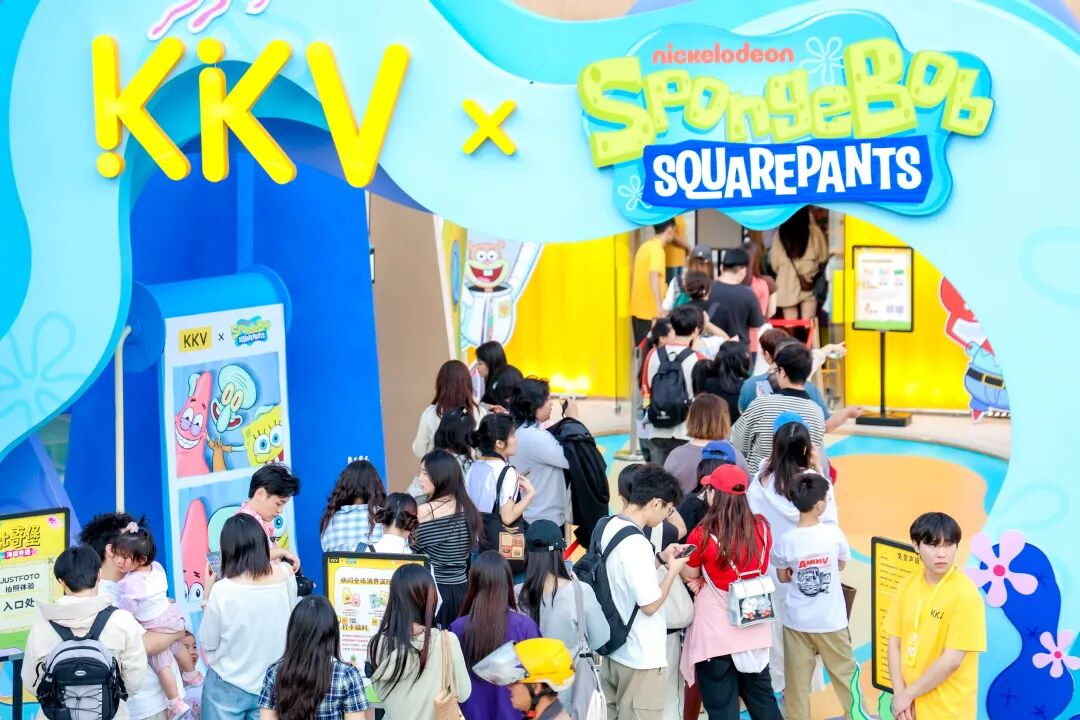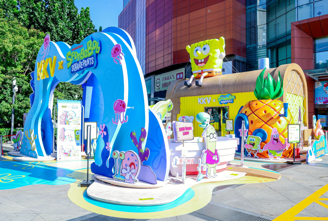在與海綿寶寶的聯(lián)名快閃當(dāng)中,KKV通過1:1復(fù)刻經(jīng)典動(dòng)畫場景,將蟹堡王餐廳、菠蘿屋、石像屋等標(biāo)志性建筑群以極具視覺沖擊感的巨物裝置方式呈現(xiàn),高度還原動(dòng)畫美術(shù)風(fēng)格,同時(shí)設(shè)置石像屋限定拍照機(jī)、章魚哥人偶國內(nèi)線下見面會(huì)首秀、80+款首發(fā)周邊等多重差異化的互動(dòng)活動(dòng),給予消費(fèi)者立體沉浸式的交互式體驗(yàn)空間,現(xiàn)場人流如織,引發(fā)打卡熱潮。