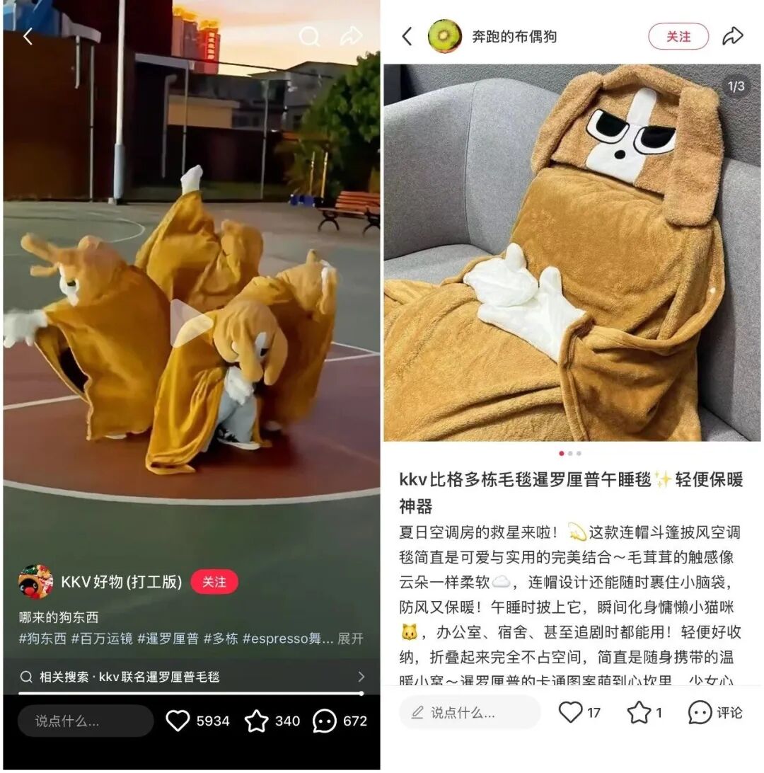 除了上文提到的“章魚哥陪睡”“比奇堡的居民們演我一天”系列外,社交媒體上,KKV與暹羅厘普共創(chuàng)的連帽午睡毯·出門扮狗咯系列產(chǎn)品,也曾引發(fā)了全網(wǎng)COS熱潮。這些產(chǎn)品自帶“社交屬性”,在社交媒體上引發(fā)了大量的二創(chuàng)互動(dòng)。這種邏輯下,產(chǎn)品不再是冰冷的物件,而是年輕人情緒表達(dá)的載體。