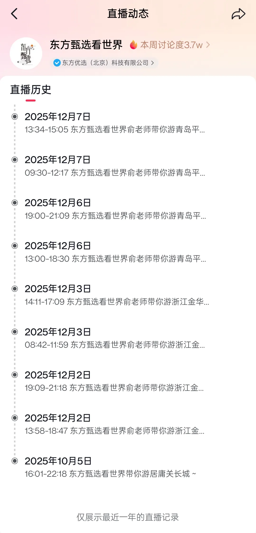 去年12月以來,“東方甄選看世界”賬號開始頻繁開播,均由俞敏洪親自坐鎮(zhèn)直播間,密集前往浙江金華、青島平度、紹興嵊州、湖北宜昌、廣東中山、重慶等多地開展文旅直播帶貨。