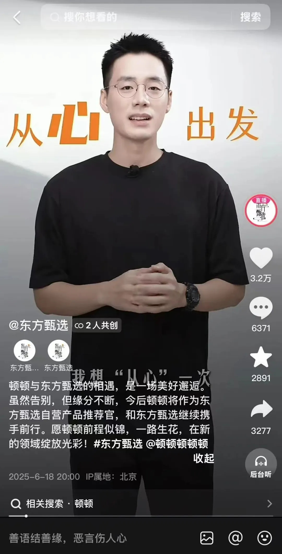 6月,東方甄選官方發(fā)文宣布頓頓離職,文中稱“頓頓與東方甄選的相遇,是一場美好邂逅。雖然告別,但緣分不斷,今后頓頓將作為東方甄選自營產(chǎn)品推薦官,和東方甄選繼續(xù)攜手前行。”
