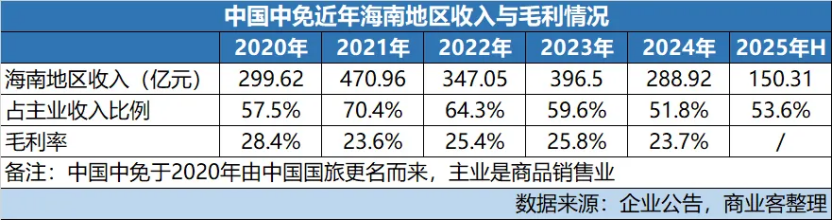 傳統(tǒng)來講,中國中免的業(yè)務(wù)優(yōu)勢在中國國內(nèi),更直接講是在海南地區(qū)。2020年更名以來,海南地區(qū)收入對中免總營收的貢獻(xiàn),長期超過50%。其中2025年上半年是53.6%。