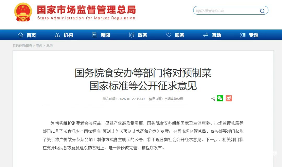 1月22日消息,國(guó)務(wù)院食安辦等部門將對(duì)預(yù)制菜國(guó)家標(biāo)準(zhǔn)等公開征求意見。