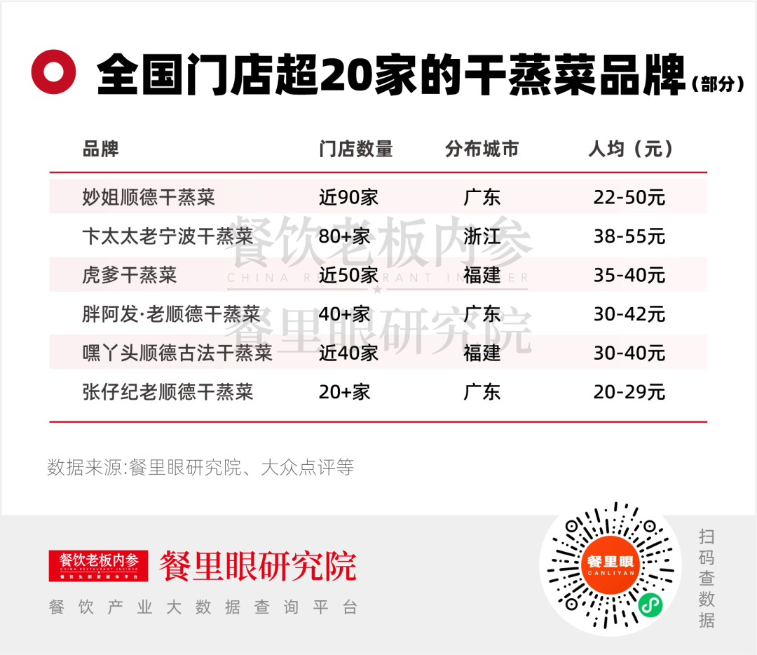 目前,全國(guó)門(mén)店超20家的干蒸菜連鎖品牌不到10個(gè),從門(mén)店分布來(lái)看,以廣東和福建區(qū)域市場(chǎng)為主,即便干蒸菜風(fēng)靡全網(wǎng),實(shí)際門(mén)店落地并未形成全國(guó)性影響力。僅僅是一道地方菜品。