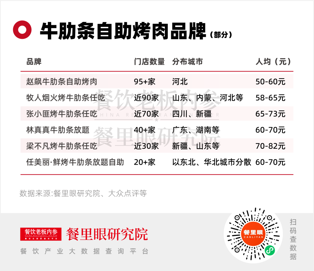 牛肋條自助烤肉品牌規(guī)模普遍不大,但從門(mén)店分布來(lái)看,似乎不存在口味市場(chǎng)壁壘,門(mén)店分散于全國(guó)各地,且人均價(jià)格相差不大。