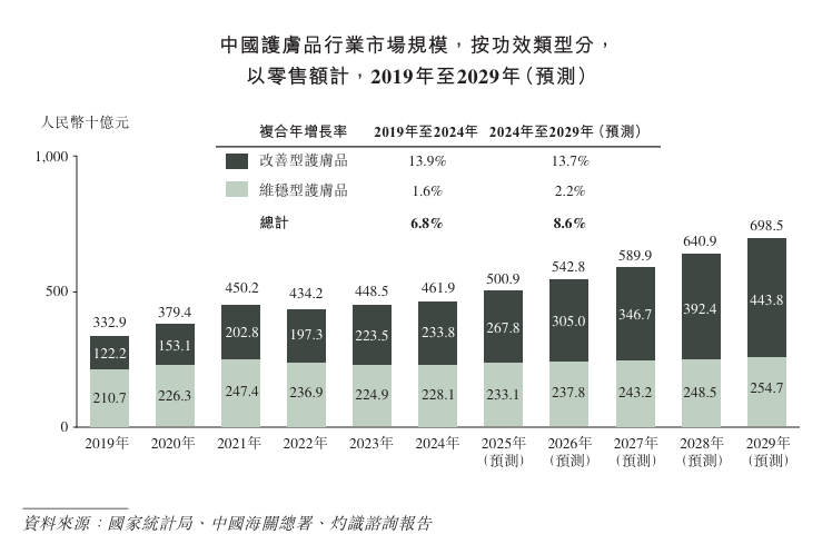 在此次HBN披露的招股書中指出,根據(jù)功效目的的不同,護(hù)膚品可分為改善型護(hù)膚品與維穩(wěn)型護(hù)膚品兩類。其中,改善型護(hù)膚可改善特性肌膚問題,如皺紋、色素沉著、暗沉及松弛,其主要功效宣稱包括抗皺、緊致、祛斑、美白提亮等改善型功能;而維穩(wěn)型護(hù)膚品可保持肌膚基本健康,主要功效宣稱包括清潔、保濕、修護(hù)、舒緩、防曬等基本護(hù)理功能。