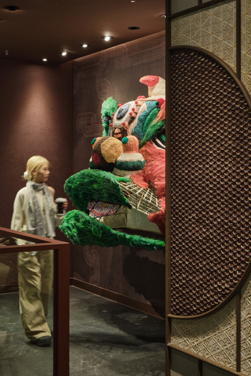 店內(nèi)多處非遺打卡點(diǎn)堪稱跨域融合的典范:一樓吧臺(tái)墻面的像素臉譜,以云南藤編為基底,用潮流像素化手法重構(gòu)粵劇經(jīng)典臉譜,悄悄融入咖啡豆紋理與咖啡器具元素,老技藝與新表達(dá)碰撞出獨(dú)特視覺(jué)火花;二樓樓梯端景墻的非遺醒獅,妙具巧思地融合粵劇戲服面料、竹編工藝與星巴克標(biāo)志性綠圍裙元素,將廣府文化的“代言人”賦予非遺新生的美好寓意。