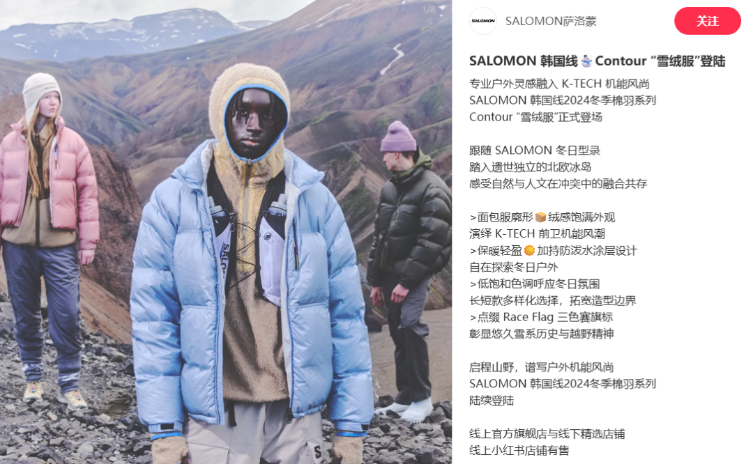 鑒于近幾年,韓國(guó)潮流文化在全球潮流舞臺(tái)的引領(lǐng)作用,以及韓國(guó)作為多山地國(guó)家的戶外消費(fèi)基礎(chǔ),薩洛蒙于是在2024年推出韓國(guó)線戶外服飾系列,豐富自己的產(chǎn)品矩陣以及品牌多元性。
