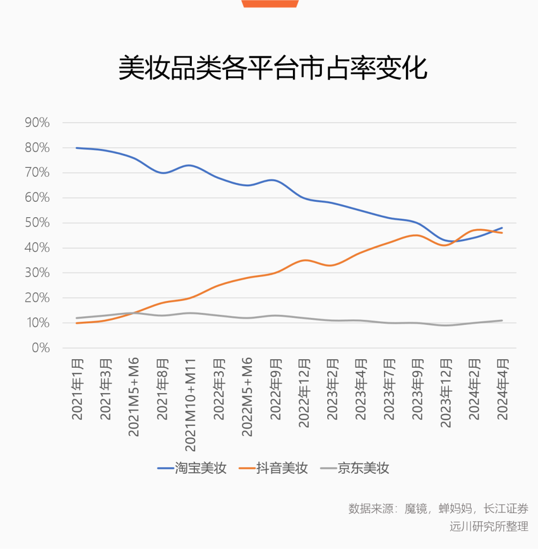 同年618大促前,首創(chuàng)證券用一組數(shù)據(jù)宣告了兩大平臺的無聲交接:17個(gè)品牌在抖音的GMV超越淘系,抖音化妝品銷售額首次反超淘天[3]。