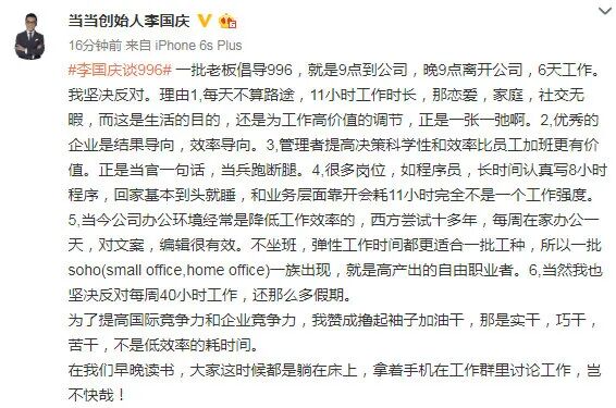 當(dāng)初馬云說“996是福報(bào)”引發(fā)全網(wǎng)炸鍋后,當(dāng)當(dāng)網(wǎng)創(chuàng)始人李國慶還曾多次公開反對996。
