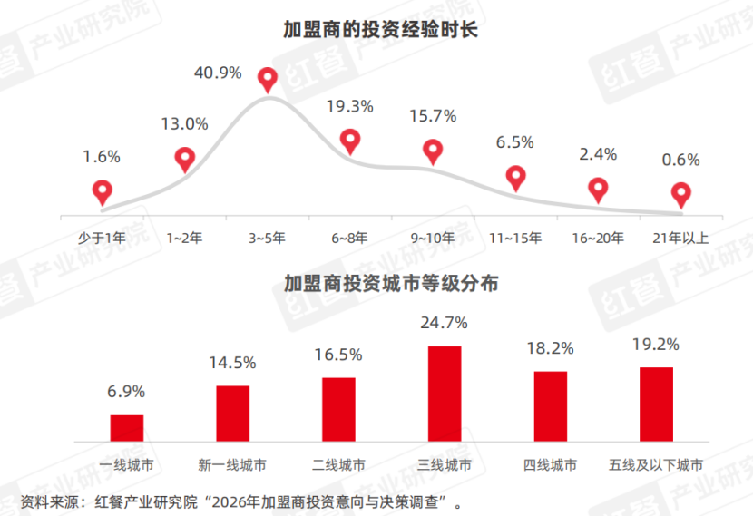 其中,成熟的職業(yè)加盟商年齡主要集中在31~40歲,他們的投資經營時長集中在3~5年,占比40.9%。在區(qū)域分布上涵蓋各個等級的城市,其中三線城市占比較高,占比24.7%。
