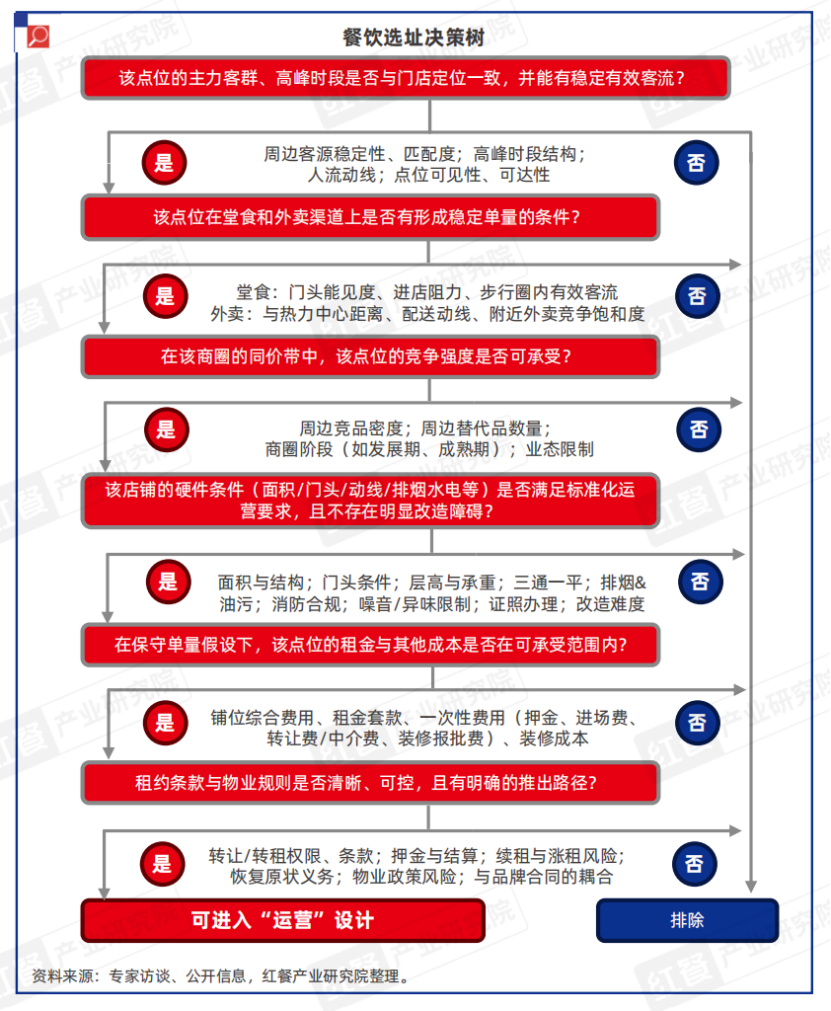 餐飲加盟選址上,不僅是找人多熱鬧的點位,還要驗證是否能跑通單店模型。紅餐產業(yè)研究院以六維決策樹作為篩選維度:有效客流是否匹配目標客群與高峰時段、交易與單量來源是否可靠、競品與替代壓力是否可承受、店型與硬條件能否按標準落地、租金與綜合成本是否符合預期、租約條款是否清晰且具備可執(zhí)行退出路徑。以上任何一項不成立,加盟商都需要審慎對待。