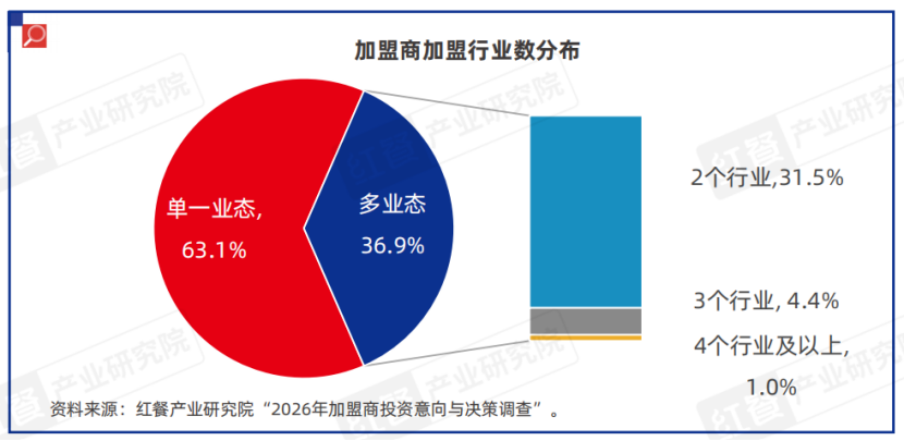 加盟行業(yè)業(yè)態(tài)布局則呈現(xiàn)單業(yè)態(tài)深耕的特征。據(jù)紅餐產業(yè)研究院“加盟商投資意向與決策調查”,63.1%的加盟商聚焦單一行業(yè),以深挖細分領域為核心?缧袠I(yè)擴張比例則相對有限,僅36.9%的加盟商布局了多業(yè)態(tài),其中31.5%的加盟商覆蓋2個行業(yè),涉足3個及以上行業(yè)的加盟商占比不足6%。