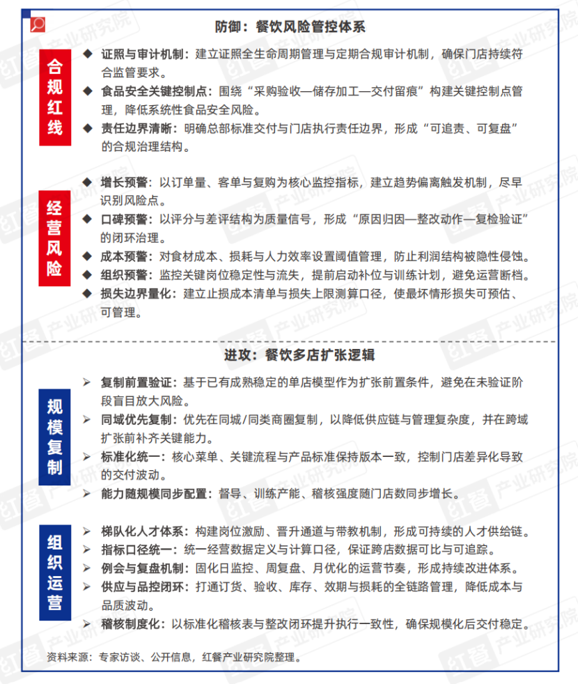 其中,防御端要把合規(guī)與食品安全做成底盤,并用關鍵經營指標建立預警與糾偏機制,確保遇到波動時能及時止損、穩(wěn)住現(xiàn)金流;進攻端則在單店模型跑通的前提下推進擴張,通過標準統(tǒng)一、人才梯隊與運營節(jié)奏,把門店能力從“單點成功”變成“批量穩(wěn)定”,實現(xiàn)規(guī)模增長但不走樣。