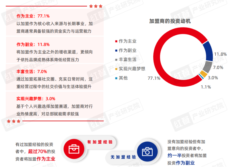 在投資動機方面,據(jù)紅餐產業(yè)研究院調研,77.1%的加盟商將加盟作為主業(yè),以此作為主要收入來源;11.8%的加盟商將其作為副業(yè),是增收的一種方式;另有7.0%和3.0%的加盟商分別出于豐富生活、實現(xiàn)興趣夢想的目的參與加盟。