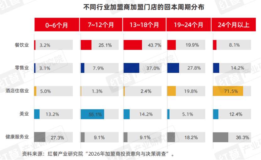 從單店回報周期來看,美業(yè)的平均回本周期最短,超過50%的美業(yè)加盟商表示其門店在7~12個月內實現(xiàn)回本。酒店住宿業(yè)的回本周期則相對較長,71.5%的加盟商表示其門店需兩年以上才能回本。不同業(yè)態(tài)的經營屬性導致了不同的盈利節(jié)奏。