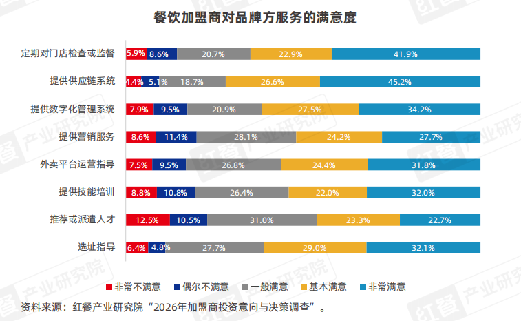 在總部賦能方面,品牌方在基礎供應鏈能力上已形成優(yōu)勢,但在人才配套服務方面仍有優(yōu)化的空間。例如,在餐飲行業(yè)中,加盟商對品牌方服務的滿意度呈分化狀態(tài):供應鏈系統(tǒng)滿意度最高,近五成加盟商給出“非常滿意”評價,僅4.4%加盟商表示“非常不滿意”;人才推薦/派遣的滿意度最低,僅22.7%加盟商表示“非常滿意”,“非常不滿意”占比達12.5%。
