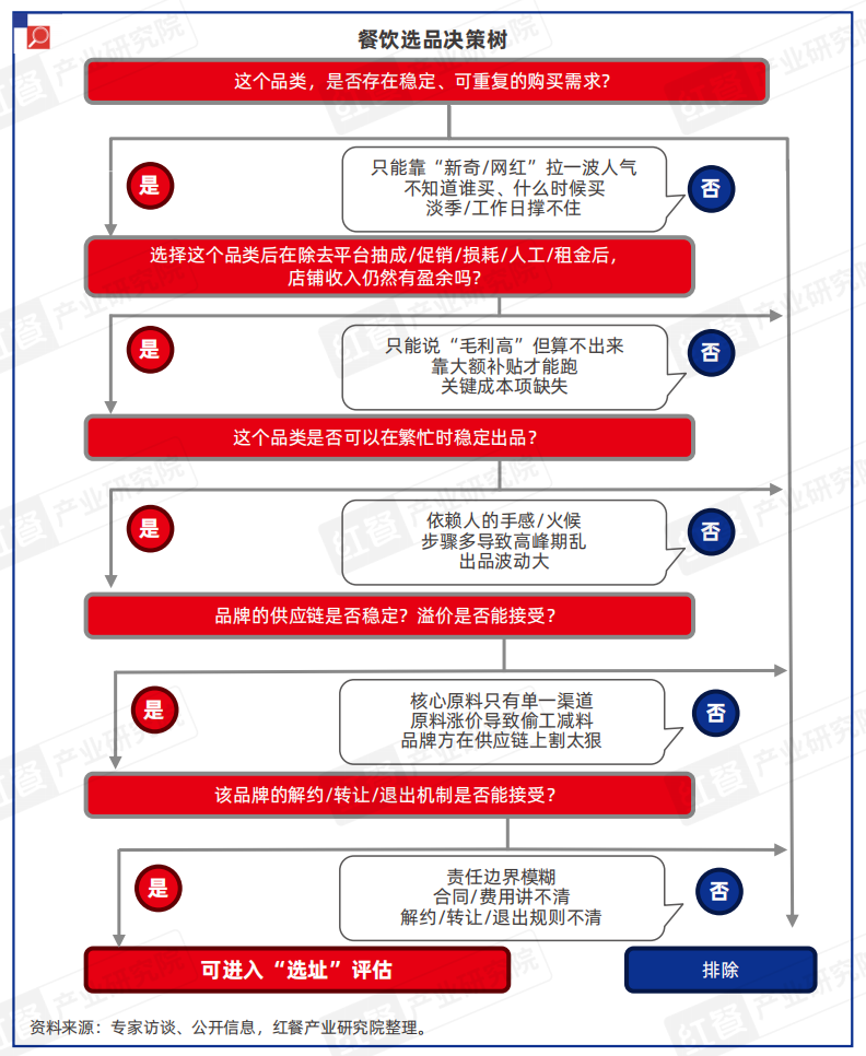 在選品策略上,餐飲加盟選品策略涵蓋品類選擇與品牌選擇。紅餐產業(yè)研究院根據(jù)品類熱度、成本、標準化、供應鏈、品牌退出機制五個維度引入選品決策樹進行校驗:先針對品類,依次核查其需求熱度、成本扣除后的盈利性、整體的標準化能力;再針對品牌,驗證供應鏈穩(wěn)定性及退出機制合理性。全環(huán)節(jié)校驗通過方可進入“選址”評估環(huán)節(jié)。