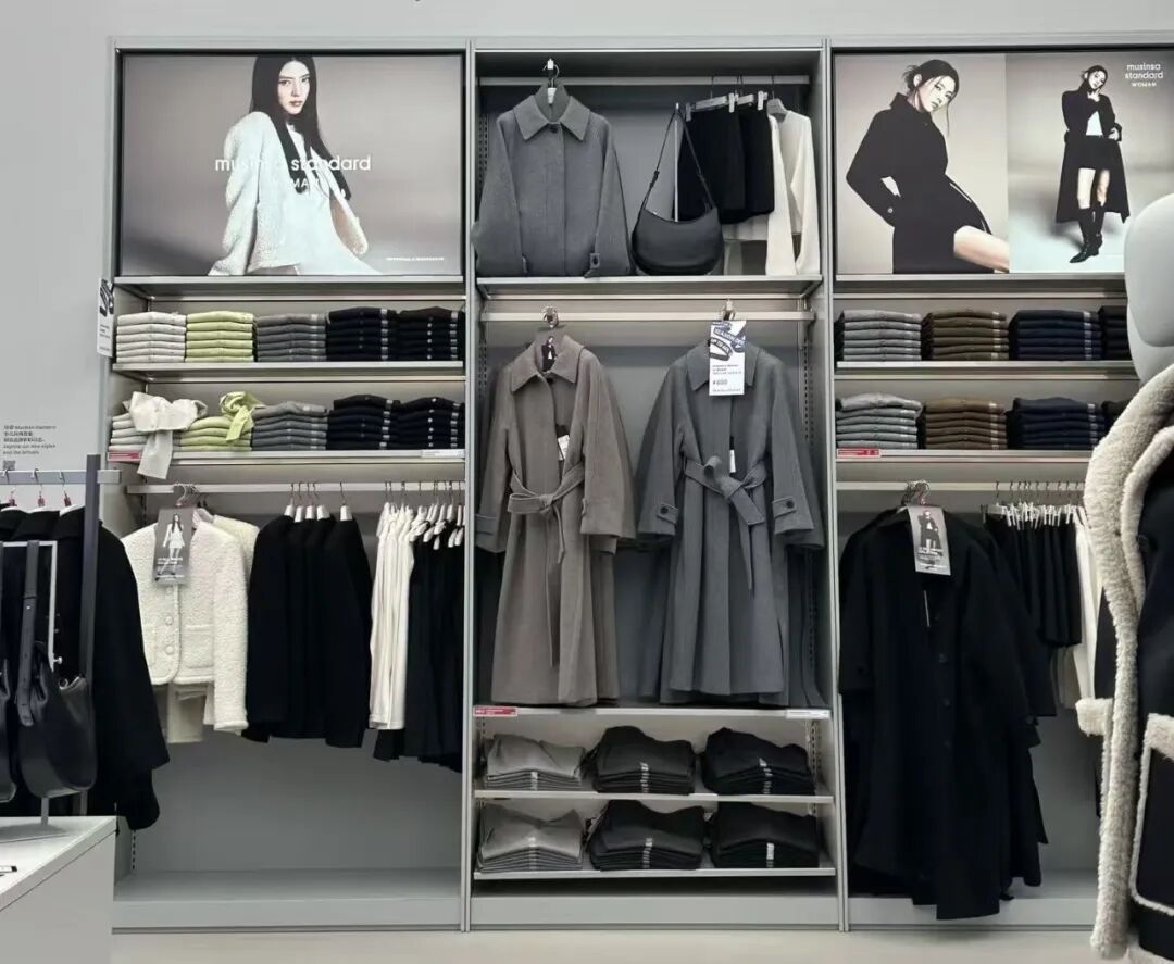 同樣主打無logo基礎(chǔ)款,優(yōu)衣庫的陳列更側(cè)重功能性分類,設(shè)計(jì)更基礎(chǔ),而Musinsa則通過成套風(fēng)格展示替代傳統(tǒng)單品陳列,提升逛店效率,強(qiáng)調(diào)“韓女穿搭”的氛圍感,簡單卻經(jīng)得起多場(chǎng)景疊穿。