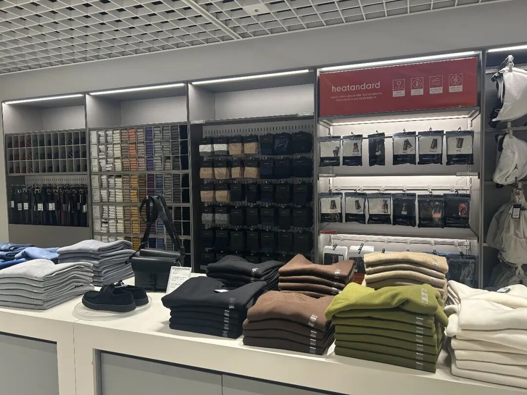 其次是商品陳列上,與傳統(tǒng)快時(shí)尚密集堆疊的貨架不同,Musinsa Standard門店以倉儲(chǔ)式大店為特色,數(shù)千件單品在開闊空間里陳列,從保暖內(nèi)衣到襯衫、費(fèi)爾島毛衣以及當(dāng)下熱門的排骨羽絨服,價(jià)格從80元到700元不等,有些商品定價(jià)略低于優(yōu)衣庫,部分商品還標(biāo)注著“一日特價(jià)”,覆蓋大眾消費(fèi)需求。