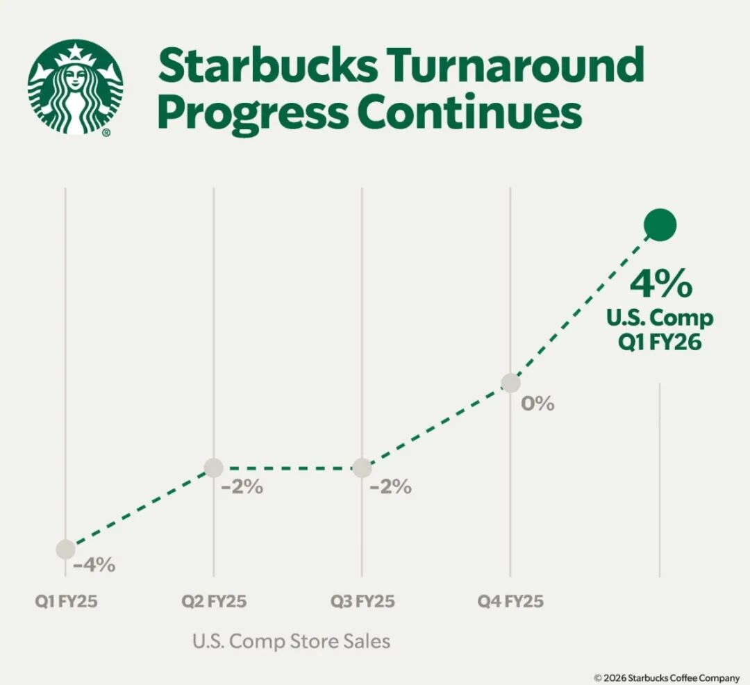 1月28日,星巴克公布了一份喜憂參半的季度業(yè)績。在截至12月28日的2026財年第一季度,客流量兩年以來首次實現(xiàn)正增長,但盈利卻受到重組影響。