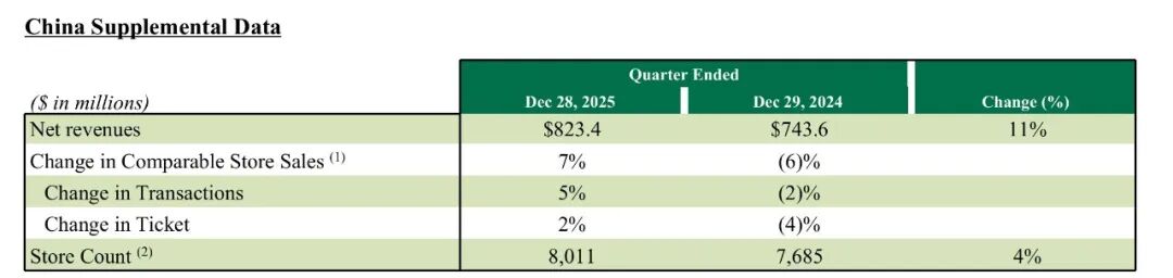星巴克的國際同店銷售額增長了5%。中國是星巴克的第二大市場,同店銷售額增長了7%;季度收入8.234億美元(約合人民幣57.19億元),同比增長11%。2025年11月,星巴克宣布計劃與博裕資本成立合資企業(yè),在中國開展業(yè)務(wù)。