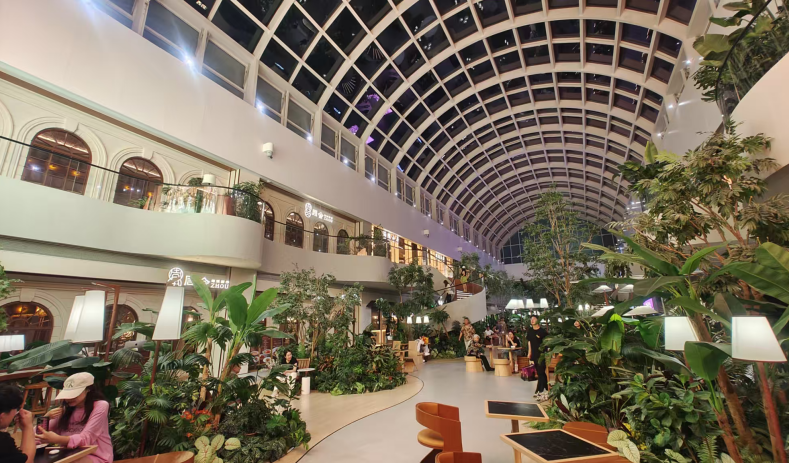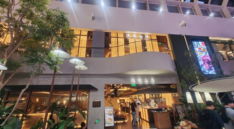 在一期7樓,昔日的電影院被改造為 “花園餐廳” 。這里移步換景,綠植環(huán)繞,古冬、周舍、滿隴山房等品質(zhì)餐飲品牌隱匿其中。顧客品嘗的不僅是美食,更是一種“在都市空中花園享用盛宴”的詩意體驗(yàn)。建筑、景觀、美食在此融匯共生,商業(yè)空間變成了可呼吸、可停留、可分享的社交客廳。