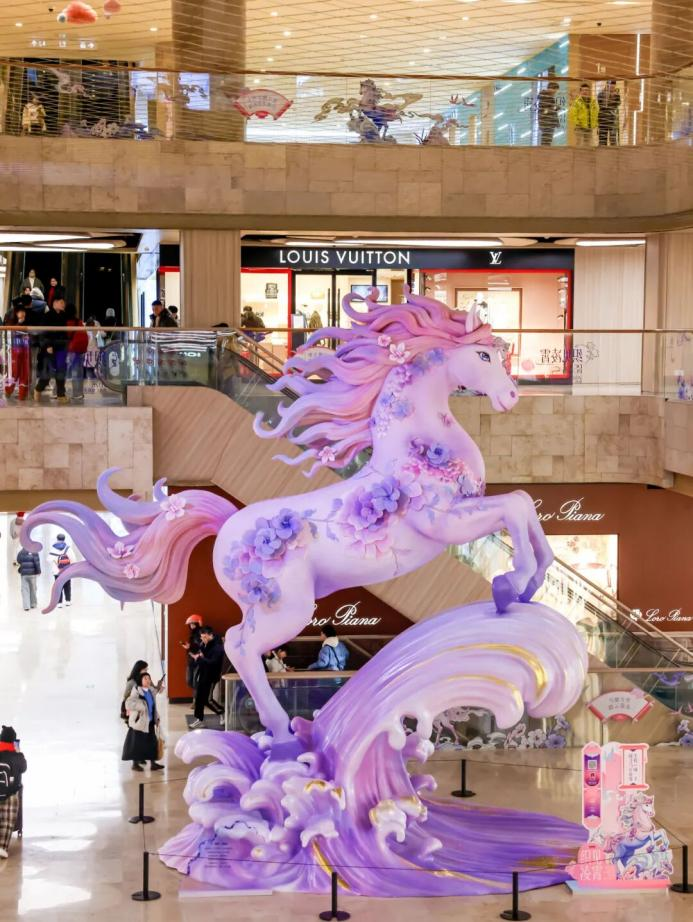 凌霄、織夢,兩匹神駿非凡、通體渲染粉紫霞光的大型藝術(shù)馬,已入駐德基廣場。根植于《山海經(jīng)》深度創(chuàng)作,喚醒公眾的文化記憶,拉開了融合觀賞、互動與傳播的立體化新春社交場域。