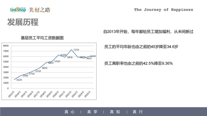 從2013年開始,我們每年幾乎只留1%左右的凈利潤,其余全部發(fā)給員工,這從員工收入變化就能看出來。2018年,基礎(chǔ)員工平均工資3814元;2019年4801元;2020年5110元;2021年6300元;2022年7259元;2023年5879元;2024年5662元;2025年6049元。