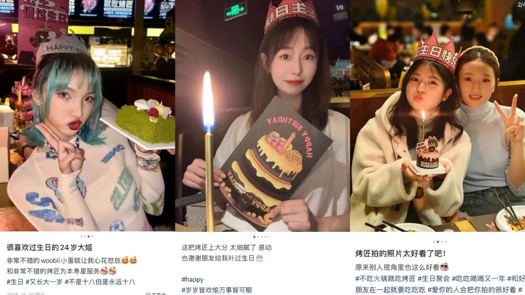 早期,烤匠的生日服務(wù)主要以贈(zèng)送“生日大禮包”為主,形式簡(jiǎn)單、易被模仿。為實(shí)現(xiàn)差異化,團(tuán)隊(duì)系統(tǒng)梳理了顧客慶生的全過(guò)程,從預(yù)訂、餐桌布置、專屬生日套餐,到切蛋糕、拍照留念及禮包贈(zèng)送,完成全流程體驗(yàn)升級(jí)。這一改造不僅提升了服務(wù)厚度,更讓烤匠憑借“不社死有驚喜”的生日體驗(yàn)成功出圈。