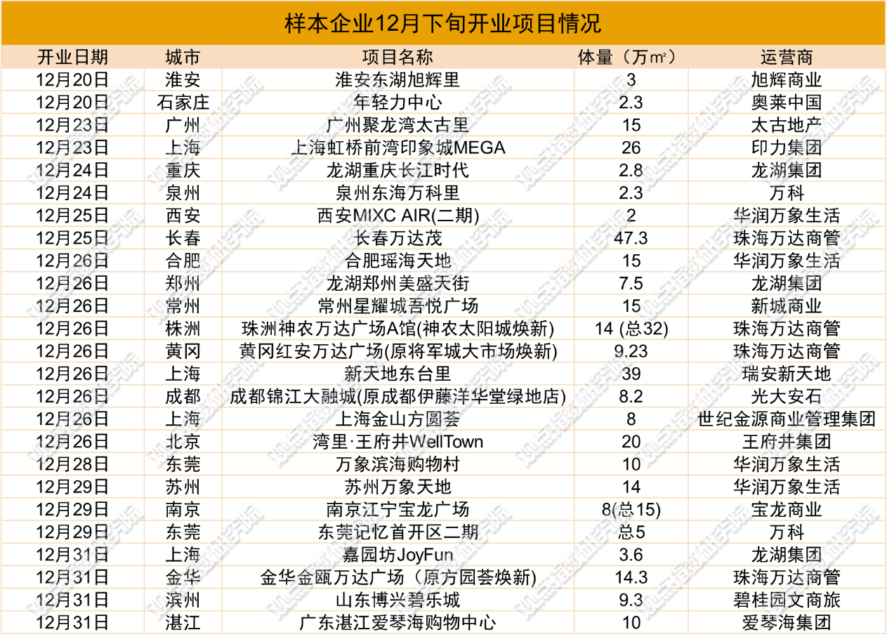 新項(xiàng)目入市方面,年末迎來了一波集中供應(yīng)。12月下旬,以太古地產(chǎn)、印力集團(tuán)、珠海萬達(dá)商管等為代表的商業(yè)地產(chǎn)企業(yè)均有新項(xiàng)目開出,涉及廣州、上海等 18 座城市。