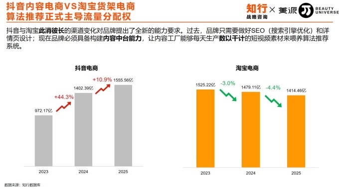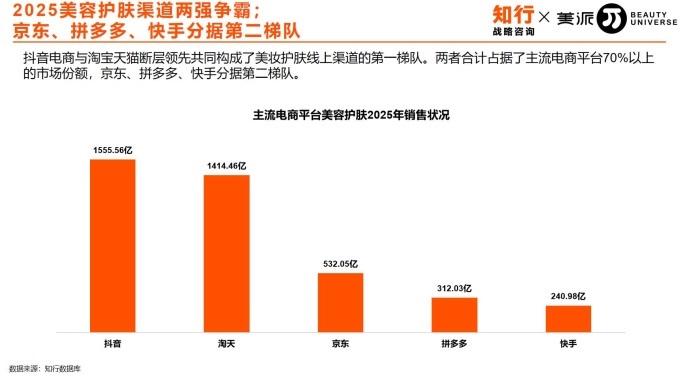 知行咨詢數(shù)智研究院數(shù)據(jù)顯示,淘寶天貓與抖音兩大平臺目前已共同占據(jù)國內(nèi)美妝電商約70%的市場份額,形成了穩(wěn)固的“雙渠道主導(dǎo)”格局。