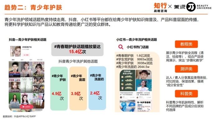 與之形成對比,抖音憑借內(nèi)容驅(qū)動與興趣推薦邏輯,持續(xù)為美妝市場提供增長動力。其整體美妝護膚GMV保持可觀增長,并在青少年護膚等新興細分賽道展現(xiàn)出爆發(fā)力。通過場景化內(nèi)容、知識科普與社交話題,抖音高效激發(fā)了用戶的潛在需求,尤其擅長助力新品類教育與新品牌破圈。例如,#青春期護膚#等話題的巨大播放量,直接拉動了相關(guān)品類的認知與消費轉(zhuǎn)化。