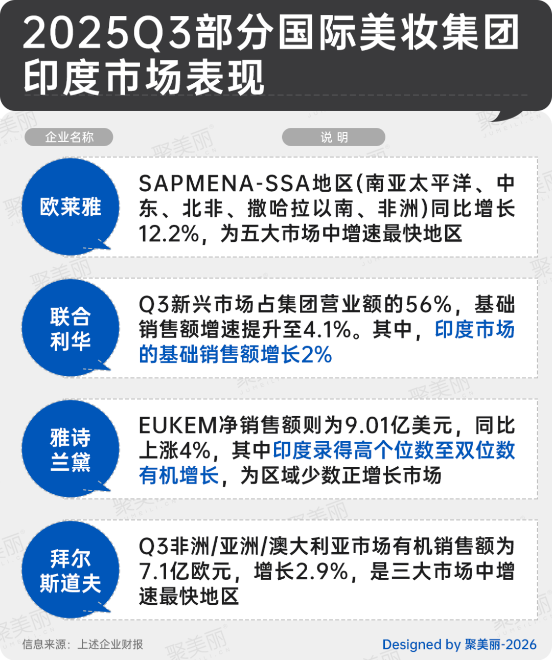 從國際巨頭的業(yè)績反饋來看,區(qū)域增長動力高度依賴印度市場的貢獻。歐萊雅在2025年Q3的財報中指出,SAPMENA-SSA地區(qū)(南亞太平洋、中東、北非、撒哈拉以南、非洲)同比增長12.2%至10.1億歐元(人民幣約83.5億元),為五大市場中增速最快地區(qū)。而按國家劃分,越南、泰國、印度和澳大利亞-新西蘭集群的增幅最強,線上渠道成為核心增長引擎。
