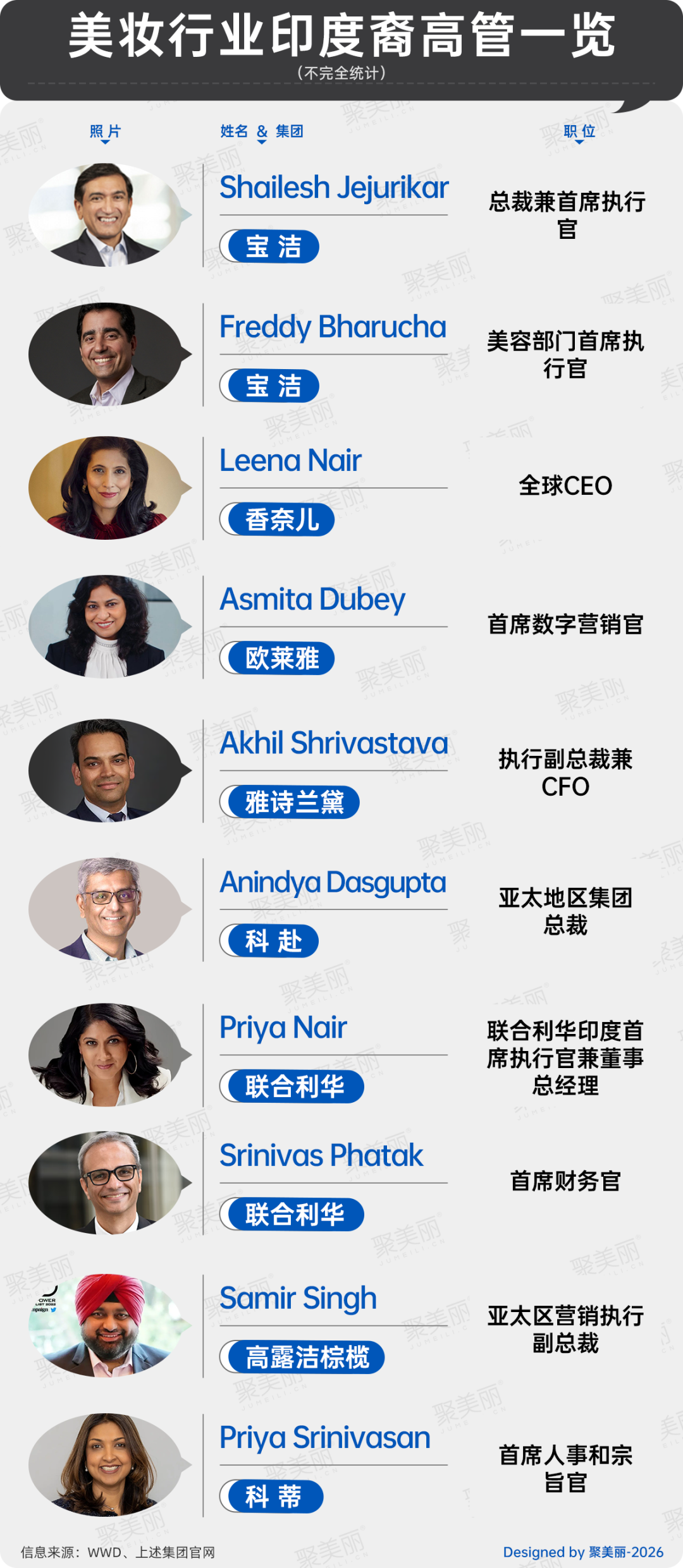 2、印度裔高管頻繁上位,成為統(tǒng)治美妝圈的重要力量,并影響著對印度市場的決策布局;