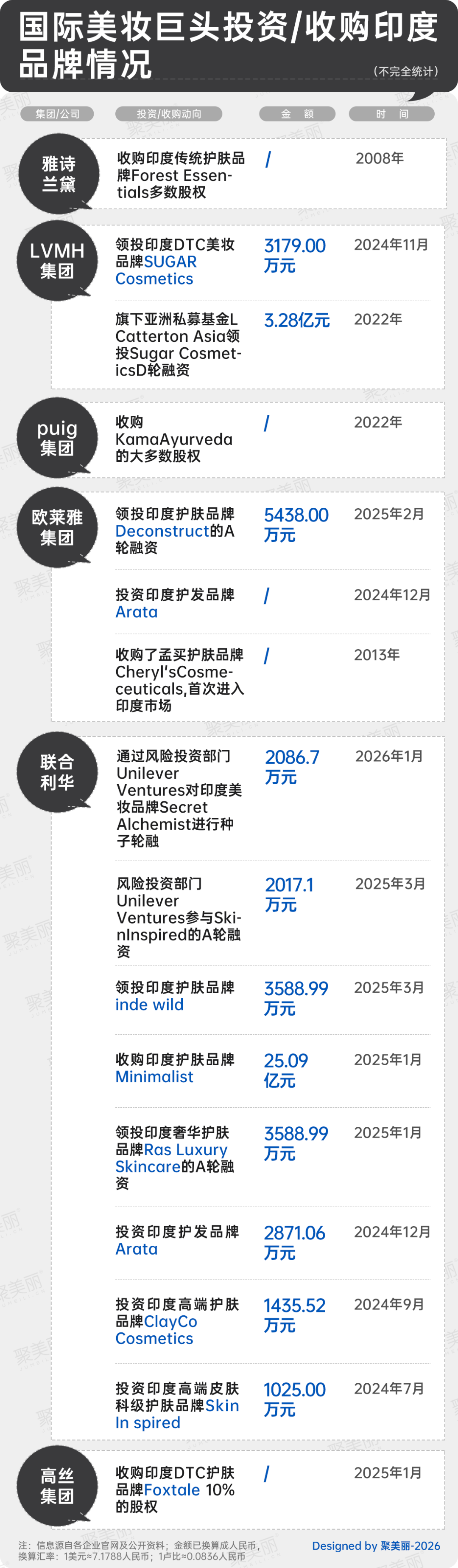 其他巨頭亦同步加快布局步伐:高絲集團于2025年收購了Foxtale 10%的股份,以擴大其在印度的業(yè)務(wù)。LVMH集團則由旗下亞洲私募基金L Catterton Asia對DTC美妝品牌SUGAR Cosmetics進行兩輪投資,投資金融共計約3.8億元。