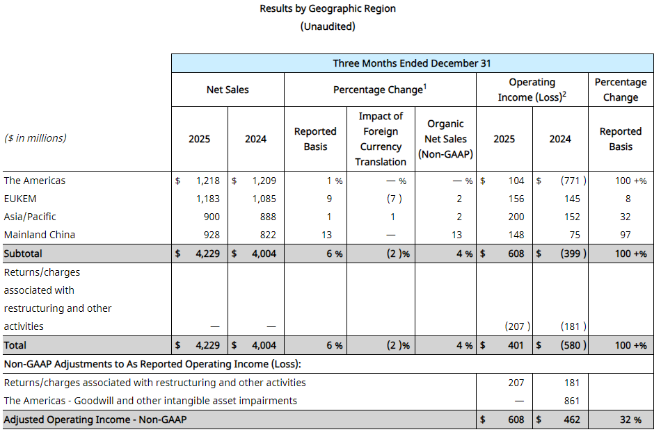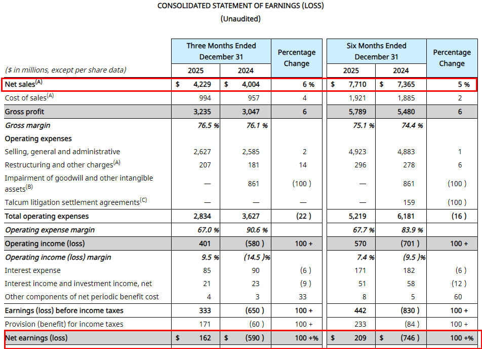 財(cái)報(bào)顯示,本季度集團(tuán)實(shí)現(xiàn)凈銷(xiāo)售額42.29億美元(約合人民幣293.53億元),同比增長(zhǎng)6%;凈利潤(rùn)層面則實(shí)現(xiàn)扭虧為盈,從2025財(cái)年同期的虧損5.90億美元(約合人民幣40.95億元),轉(zhuǎn)為盈利1.62億美元(約合人民幣11.24億元),同比大幅改善127%。