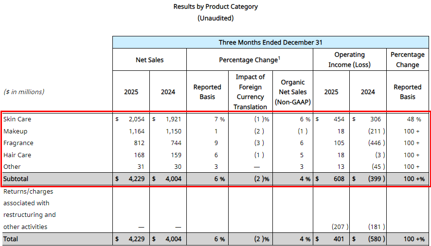 與此同時(shí),財(cái)報(bào)還披露雅詩(shī)蘭黛2026財(cái)年上半年(2025年7月1日-12月31日)凈銷(xiāo)售額同比增長(zhǎng)5%至77.10億美元(約合人民幣535.14億元);凈利潤(rùn)同樣實(shí)現(xiàn)大幅扭虧為盈,較上一財(cái)年同期大漲128%,從虧損7.46億美元(約合人民幣51.78億元)轉(zhuǎn)為盈利2.09億美元(約合人民幣14.51億元)。