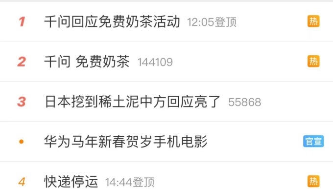 首輪福利以奶茶免單形式推出。用戶領(lǐng)取的免單卡可在全國(guó)超過(guò)30萬(wàn)家奶茶店使用,涵蓋喜茶、奈雪、瑞幸等多個(gè)品牌;顒(dòng)上線后,由于訪問(wèn)量過(guò)大,頁(yè)面一度崩潰。社交媒體上,“千問(wèn) 免費(fèi)奶茶”迅速成為熱搜話題。