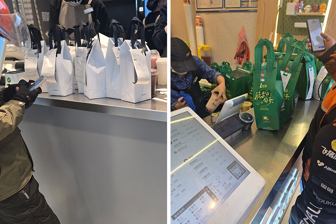 附近商場里的茉莉奶白,店里店員正來回穿梭,背后的小票像瀑布一樣,做好的奶茶堆在一起,包裝上用馬克筆做了單號標(biāo)記方便騎手取餐。