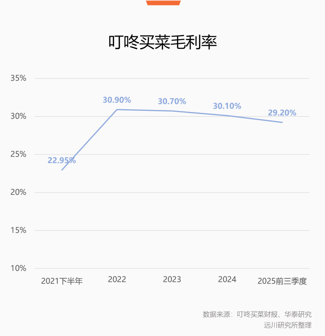 這一策略效果顯著。2022年至今,叮咚買(mǎi)菜的毛利水平維持在30%區(qū)間,遠(yuǎn)高于只有10%左右的每日優(yōu)鮮,超越超市類(lèi)企業(yè)生鮮毛利率(13-19%),已經(jīng)達(dá)到預(yù)制菜企業(yè)的毛利水平(22%-27%)[5]。