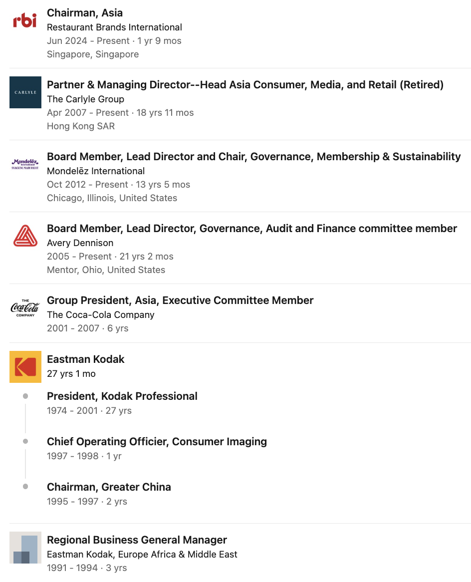 1995年到1997年,Patrick Siewert擔(dān)任柯達(dá)大中華區(qū)董事長。2001年到2007年,Patrick Siewert的職位是可口可樂公司亞洲區(qū)集團(tuán)總裁。從2007年開始,他負(fù)責(zé)凱雷集團(tuán)在亞洲地區(qū)的消費(fèi)、媒體和零售投資長達(dá)16年。