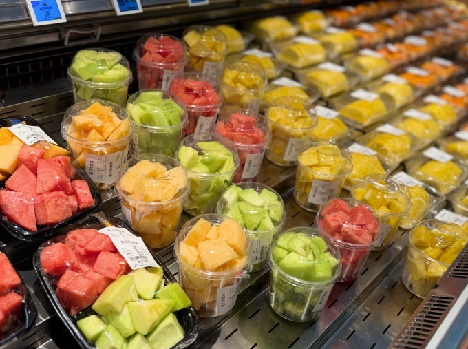 水果區(qū)的盒裝芭樂、藍(lán)莓整齊碼放,每盒分量適中,價(jià)格優(yōu)惠;生鮮區(qū)的肉類已經(jīng)分割處理,蔬菜帶著水汽透著新鮮;果切區(qū)域嚴(yán)格遵循“468”法則,超過4小時(shí)八折、6小時(shí)六折、8小時(shí)下架,確保顧客吃到的都是新鮮食材。