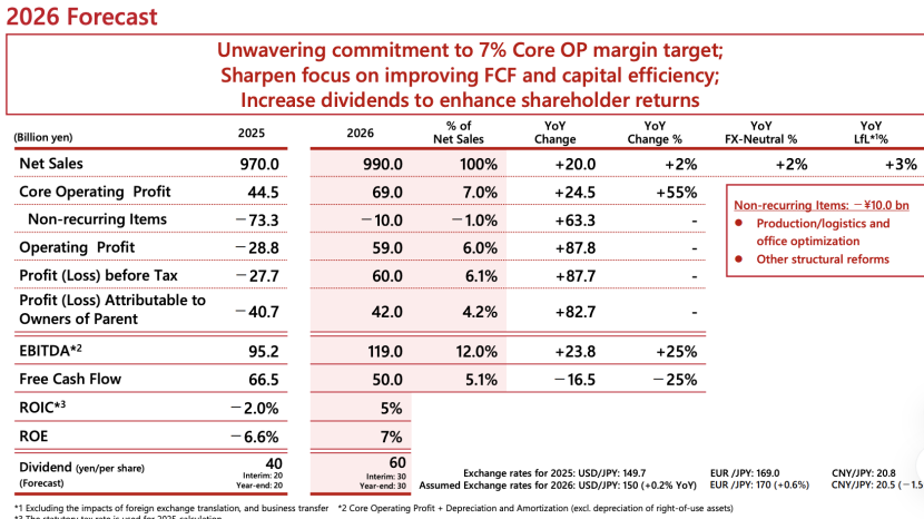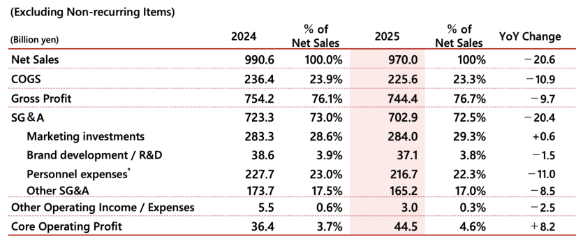 而在近日,資生堂公布了2025年財(cái)報(bào),凈銷(xiāo)售額為9699.92億日元(約合人民幣437.11億元),同比下滑2.1%,核心營(yíng)業(yè)利潤(rùn)達(dá)到445.2億日元(約合人民幣20.06億元),同比大漲22.4%。雖然營(yíng)業(yè)利潤(rùn)仍虧損了287.88億日元(約合人民幣12.97億元),但因?yàn)榻当驹鲂У呐e措,其核心營(yíng)業(yè)利潤(rùn)比之前預(yù)期的365億日元(約合人民幣16.45億元)有大幅增長(zhǎng),利潤(rùn)率達(dá)到4.6%。