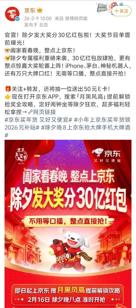 近日,京東正式宣布,將于2月16日除夕當天晚8點,開啟“月黑風高”超級盛典,邀請廣大用戶瓜分30億紅包和實物大獎。