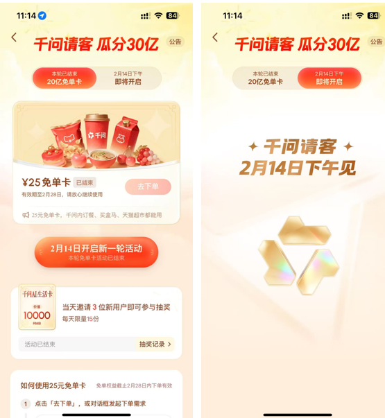 千問選擇“場景深耕與實(shí)物免單”路線,以“30億元春節(jié)請客計(jì)劃”切入本地生活。其核心權(quán)益是25元免單卡,用戶只需語音說出“千問幫我點(diǎn)奶茶”,即可完成核銷。為撬動(dòng)拉新,平臺(tái)設(shè)置“邀請新用戶再得1張”的機(jī)制,最高可累計(jì)20張。