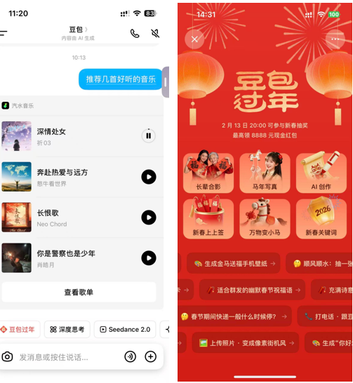 在產(chǎn)品端,用戶通過“豆包過年”專區(qū)體驗(yàn)穿搭指導(dǎo)、新春文案生成、AI長輩合影等功能,即可參與抽獎(jiǎng),最高可領(lǐng)取8888元現(xiàn)金紅包。