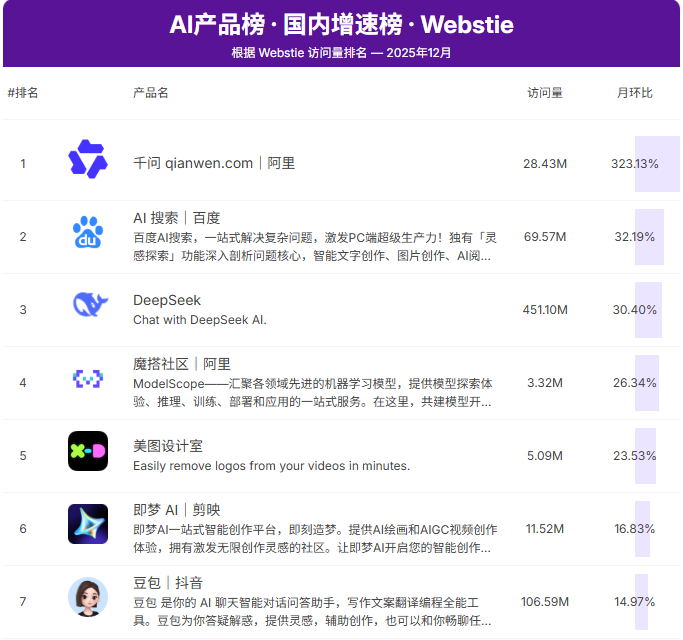 另一方面,行業(yè)競爭呈現(xiàn)明顯的梯隊(duì)差異:字節(jié)靠速度制勝,阿里開源生態(tài)強(qiáng)勁但C端入場偏晚,騰訊則借助DeepSeek與微信生態(tài)快速追趕。AI產(chǎn)品榜數(shù)據(jù)顯示,2025年12月千問以323.13%的環(huán)比增長率大幅領(lǐng)先豆包的14.97%,但其28.43M的訪問量與豆包的106.59M仍存在明顯差距。